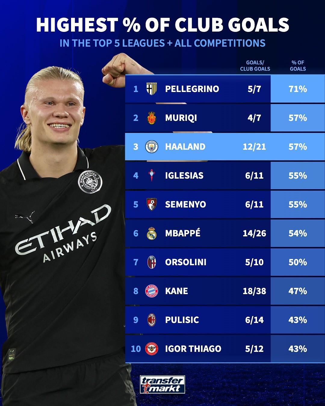 德国转会市场网站近日公布了本赛季五大联赛球员进球占球队总进球比例的排行榜,其中曼城前锋哈兰德以57%的占比排名第三,展现了其强大的进攻火力。