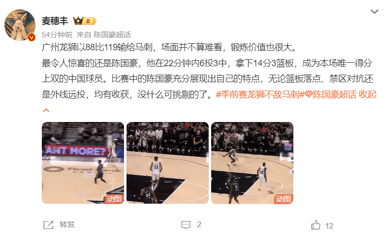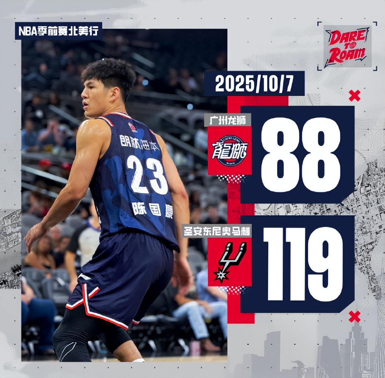北京时间10月7日,NBA季前赛上演了一场备受瞩目的对决,广州男篮以88-119的比分不敌马刺队。尽管马刺队此役并未派出全主力阵容,福克斯、索汉、卡斯尔、奥利尼克、瓦塞尔、哈珀等人均未出战,就连核心球员文班亚马也仅打了16分钟,但CBA级别的球队与NBA级别的球队之间的差距依然显而易见。在这场较量中,广州男篮的最大亮点无疑是陈国豪。