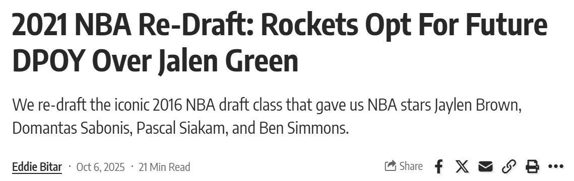 火箭队看走眼!在季前赛开打、新赛季即将来临之际,美媒《fadeawayworld》对公认的选秀大年2021届选秀进行了重新排名,其中杰伦·格林跌至第7,而湖人队则通过押宝落选秀意外捡到了大宝贝。