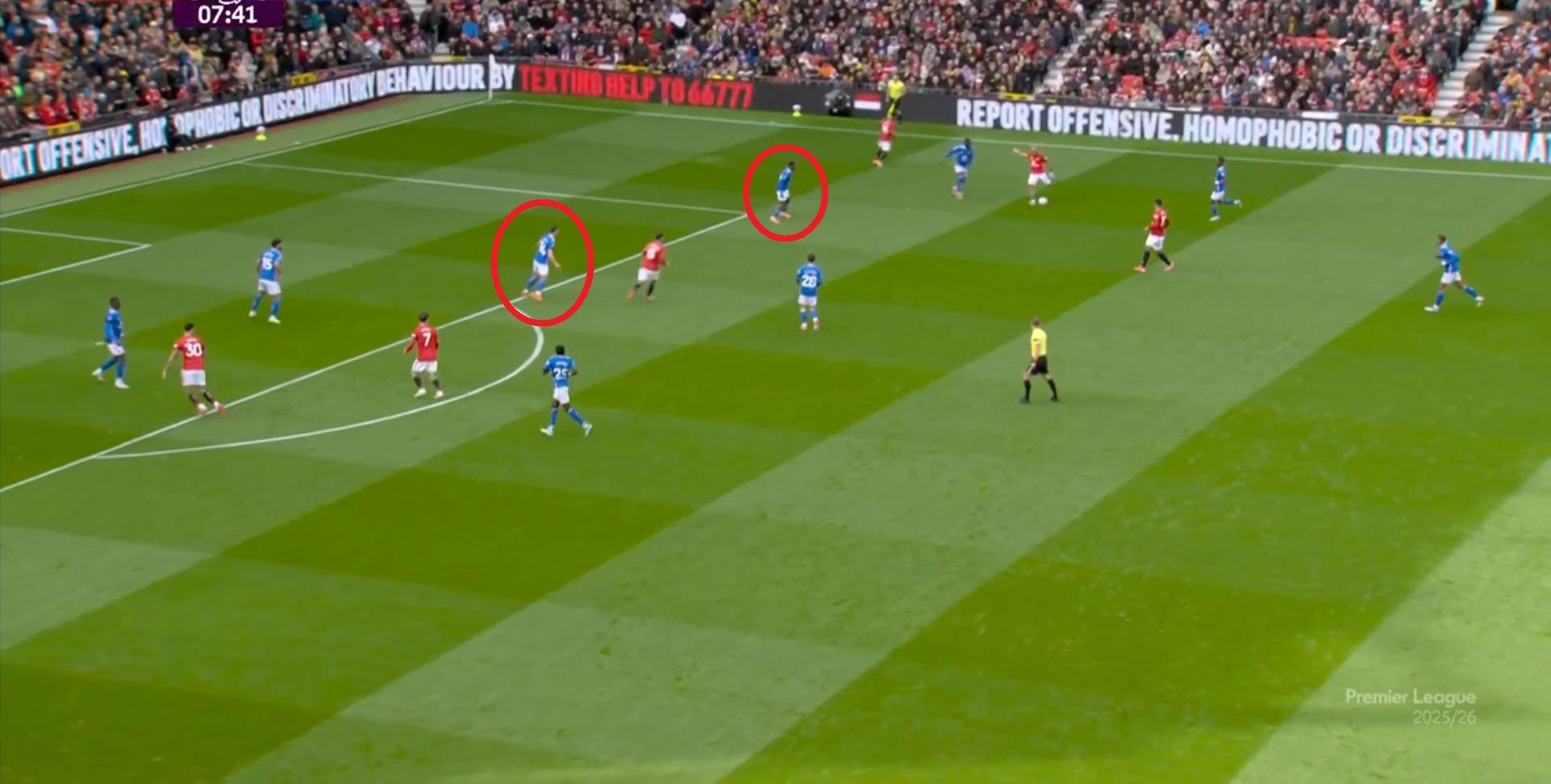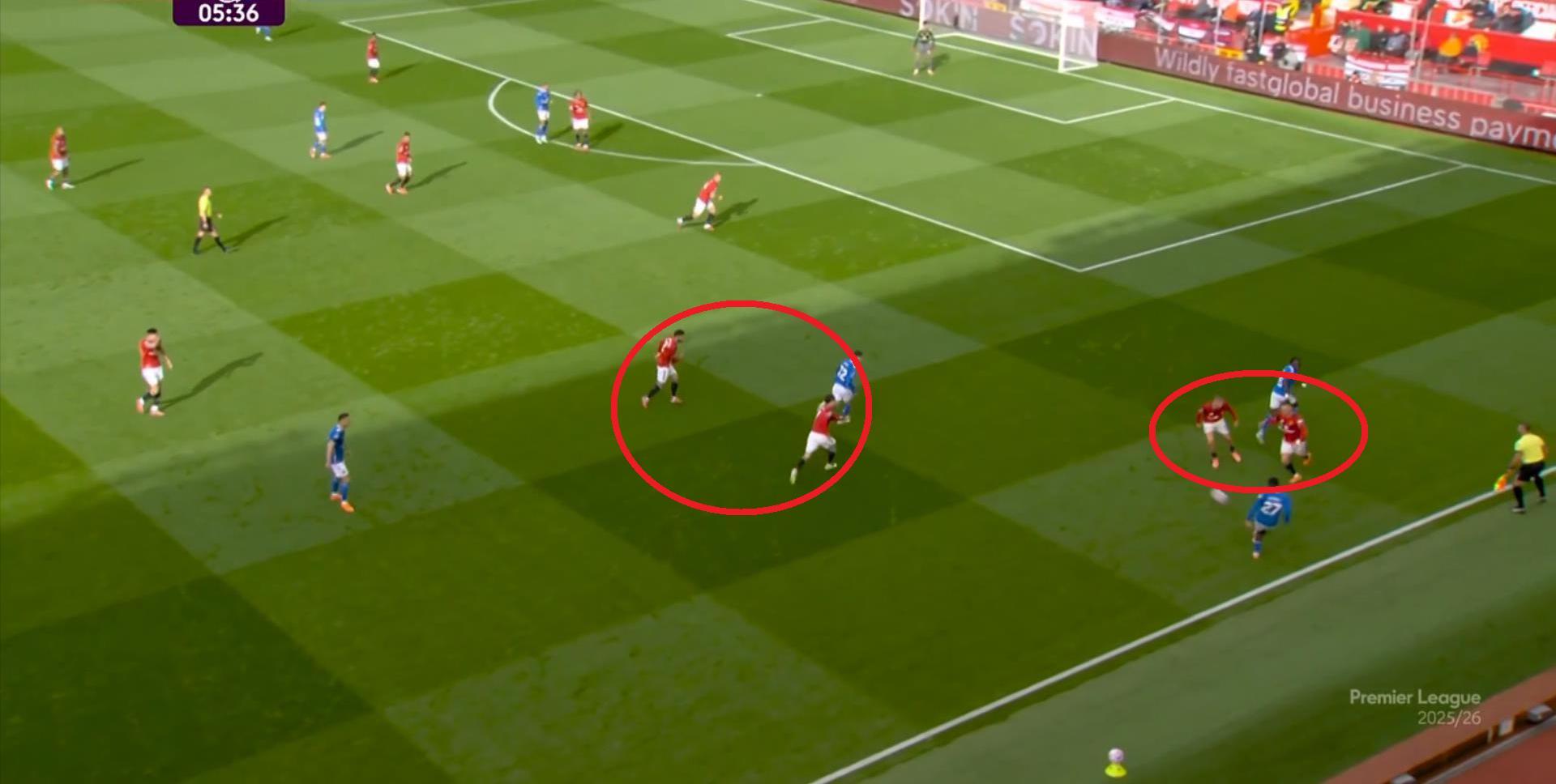 所以在这短短的几分钟里,你就可以看到曼联在攻防两端的效率问题了,但在这一点之外,也应该预判到点位上如果布置了不同的球员,这些攻防表现可能会发生什么样的变化,也可以看到阿莫林的343体系在利用什么空间和优势,具体在打什么东西。