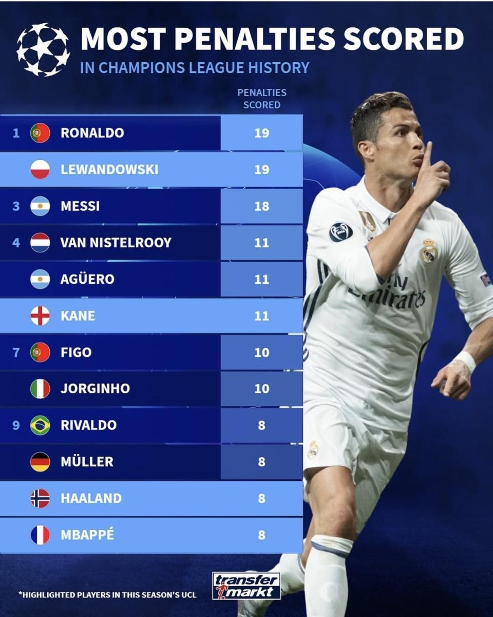 这份榜单最引人注目的是“点球占比”的排序:从高到低依次是——若日尼奥100%(9/9)、菲戈41.67%(10/24)、里瓦尔多29.63%(8/27)、阿圭罗26.83%(11/41)、凯恩26.19%(11/42)、范尼斯特尔鲁伊19.64%(11/56)、莱万18.10%(19/105)、哈兰德16.33%(8/49)、穆勒14.04%(8/57)、姆巴佩14.04%(8/57)、梅西13.95%(18/129)、C罗13.57%(19/140)。按比例看,C罗不仅不“靠点球”,反而是这组顶级射手里点球占比最低的一个。