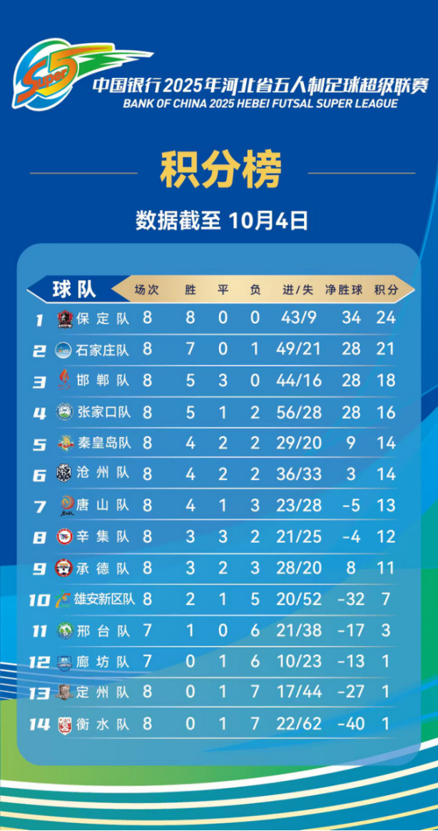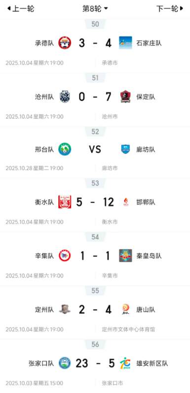 从最新积分榜来看,上轮比赛结束后积分榜前三的球队本轮全部取胜,排名未发生变动。保定队以8胜0负积24分稳居榜首;石家庄队7胜1负积21分紧随其后暂列第二位;邯郸队5胜3平积18分排名第三,三支球队构成了联赛第一梯队,竞争异常激烈。