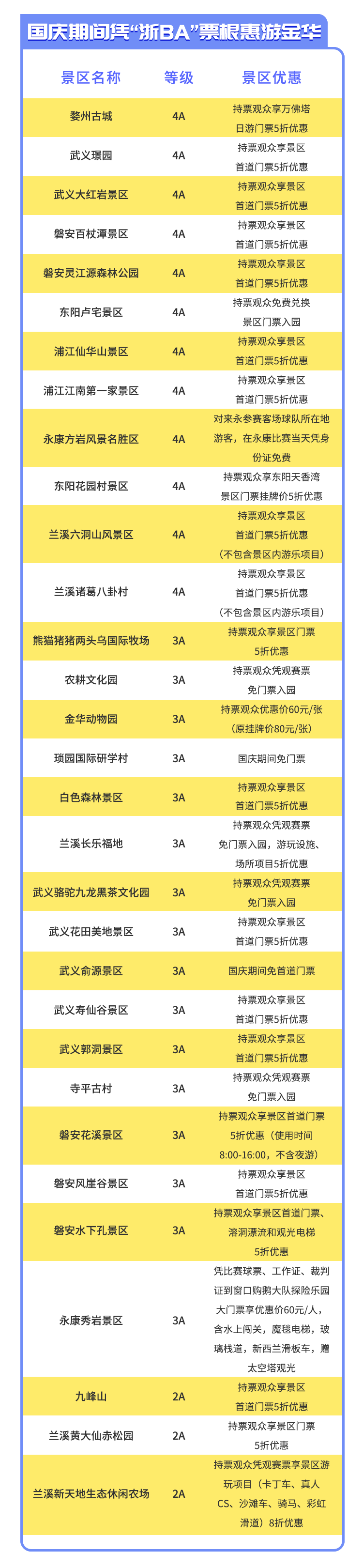 国庆中秋假期,球迷凭“浙BA”的实体门票或电子购票凭证,即可在游览婺州古城、武义璟园等31家景区时享受专属门票优惠(具体政策以各景区现场公告为准)。