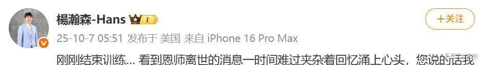 距离NBA开拓者队的季前赛首秀仅剩两天,正在备战的杨瀚森结束训练后,得知了恩师徐长锁离世的消息。这位今年6月以16号秀身份进入NBA的年轻人,未能等到在赛场上让恩师看到自己的表现,52岁的徐长锁便永远离开了他热爱的篮球事业。