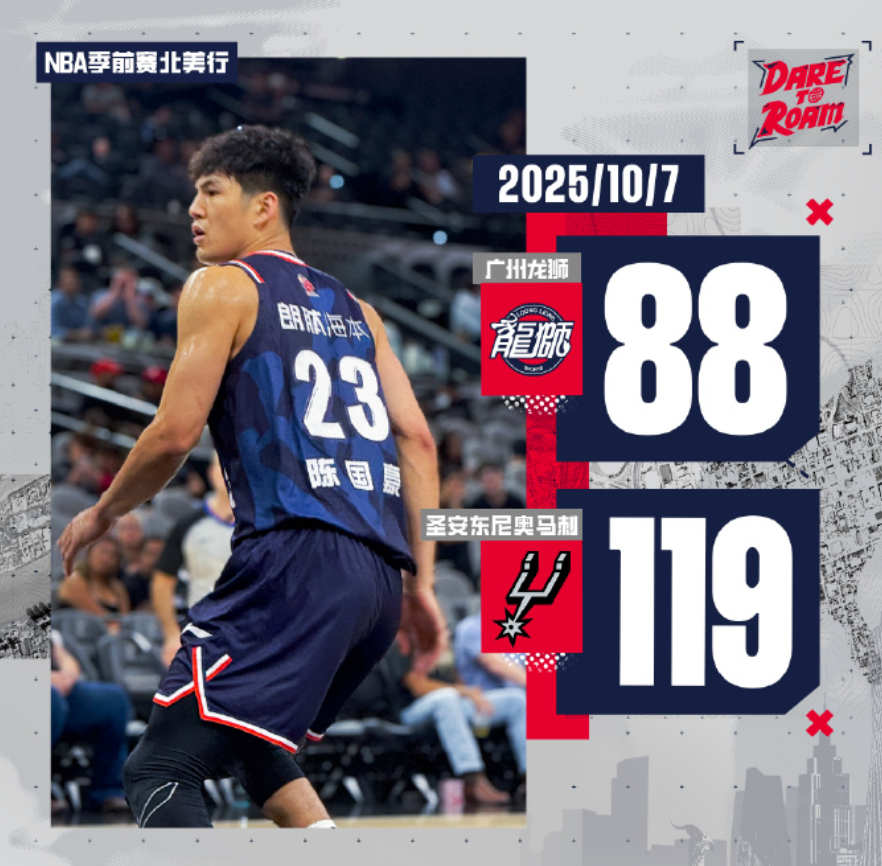北京时间今日,NBA季前赛迎来一场备受瞩目的对决——圣安东尼奥马刺队与CBA广州龙狮男篮展开跨联盟较量。作为马刺队新赛季首场季前赛,这场比赛虽无胜负悬念,却因中国球员的亮眼表现引发广泛关注。