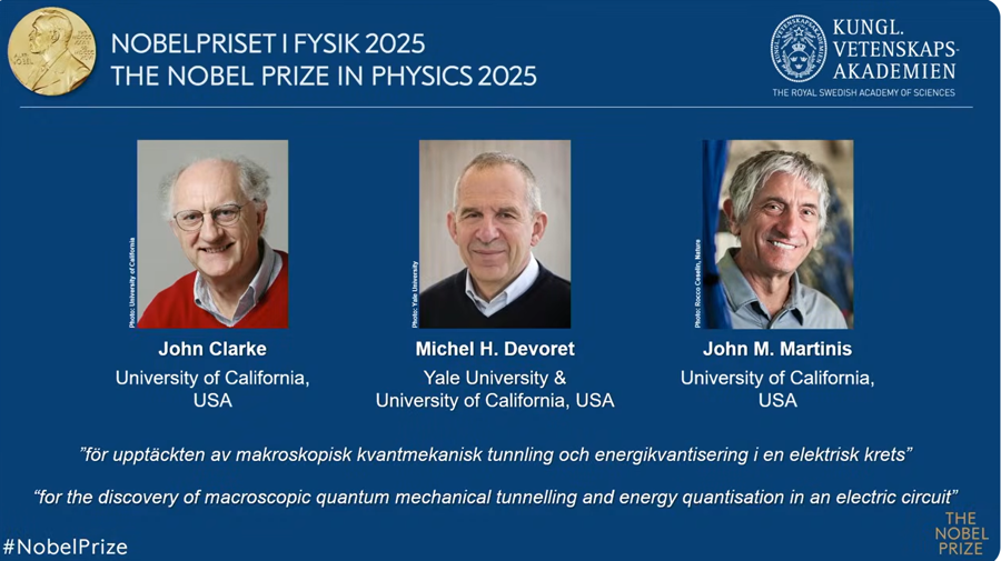 北京时间10月7日,全球科学界迎来重大时刻——瑞典皇家科学院在斯德哥尔摩正式宣布,2025年诺贝尔物理学奖授予三位美国科学家:约翰·克拉克(John Clarke)、米歇尔·H·德沃雷特(Michel H. Devoret)和约翰·M·马丁尼斯(John M. Martinis)。这一奖项旨在表彰他们在量子物理领域的前沿突破,具体为“在电路中实现宏观量子力学隧穿和能量量子化的实验验证与理论构建”。