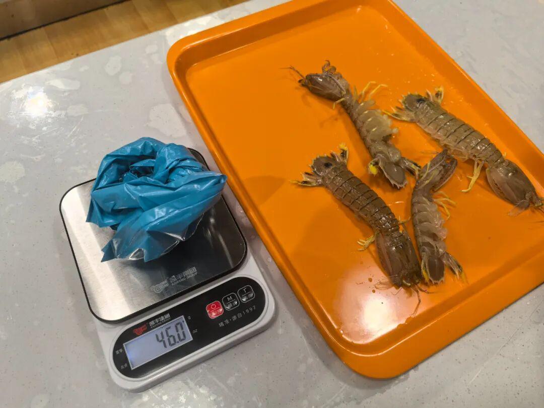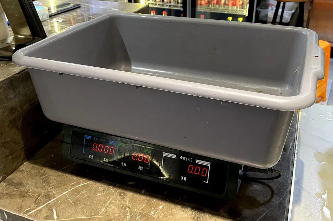 记者的复秤在报社食堂进行,用的是可以精确到0.1克的电子秤。记者先取出海鲜,称了带水的塑料袋,然后将水倒出,称空袋子(单位:克)。