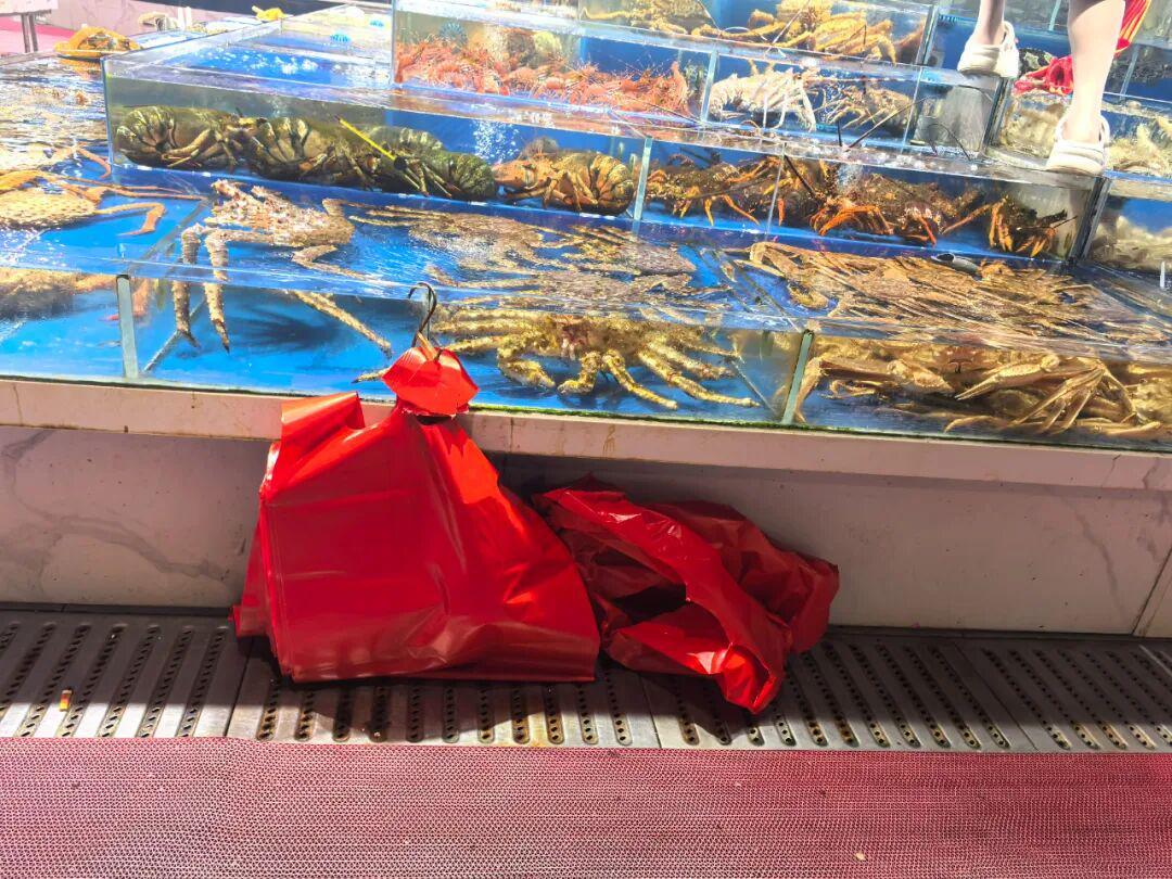 家住白荡海小区的傅大姐告诉记者,她看到海鲜排档几乎每家都挂着厚塑料袋,就不想买了。记者在点评平台上也发现,关于农发·城市厨房的海鲜排档的差评,很多矛头直指海鲜排档的厚塑料袋。