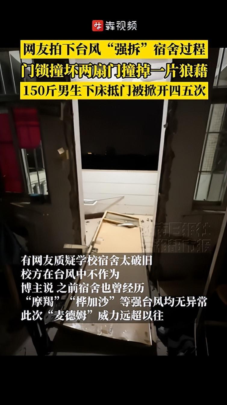 据视频拍摄者回忆,宿舍位于教学楼南侧,正对风口且前方无遮挡物。台风来袭时,宿舍大门首先被狂风直接吹开,随后穿堂风瞬间将阳台门撞开,两扇门的门锁均被严重撞变形。他本人体重150斤,在大门被吹开的第一时间下床试图抵住门板,但风力过于强劲,门板在几分钟内被掀开四五次。