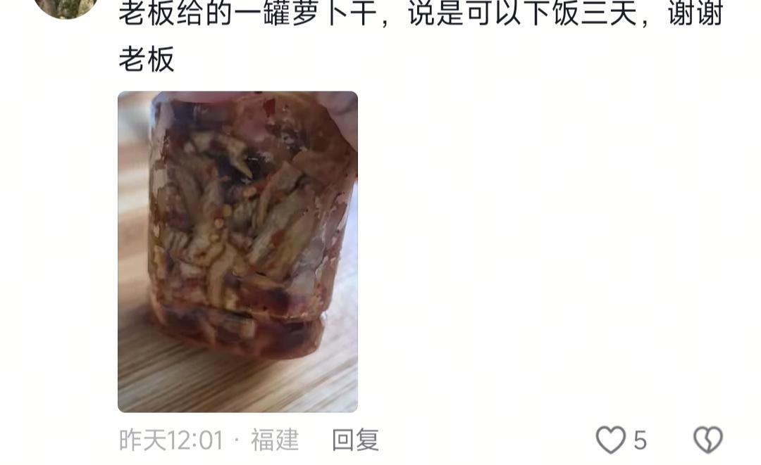 还有老板发萝卜干,说是可以下饭三天。