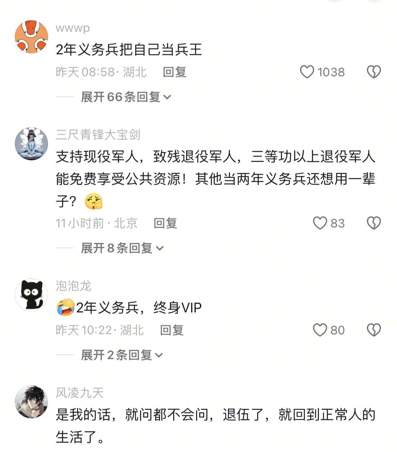 然而,这位退役军人的遭遇却引来了网友们的调侃。在评论区里,有网友调侃他当了两年义务兵就把自己当成了“兵王”。还有网友支持地铁的做法,认为应该只有现役军人、致残退役军人以及三等功以上的退役军人才能享受免费的公共资源,而两年义务兵则不应享受此待遇。
