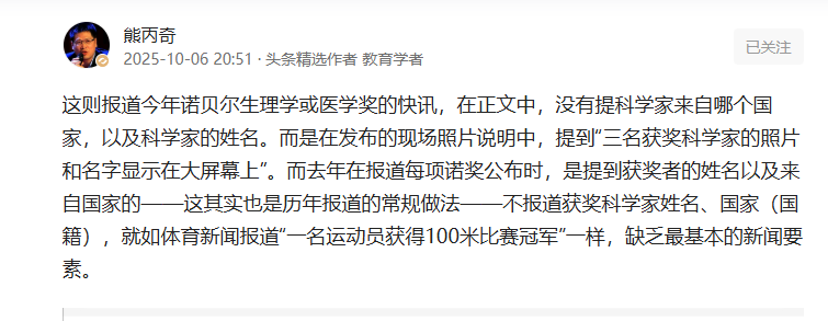 2025年10月6日,知名教育学者熊丙奇通过社交媒体发文,直指新华社当日发布的诺贝尔生理学或医学奖报道存在严重信息缺失。这篇题为《科学报道的完整性何在?》的评论迅速引发网络热议,将一场关于新闻专业性的讨论推向更深层的文化认知层面。