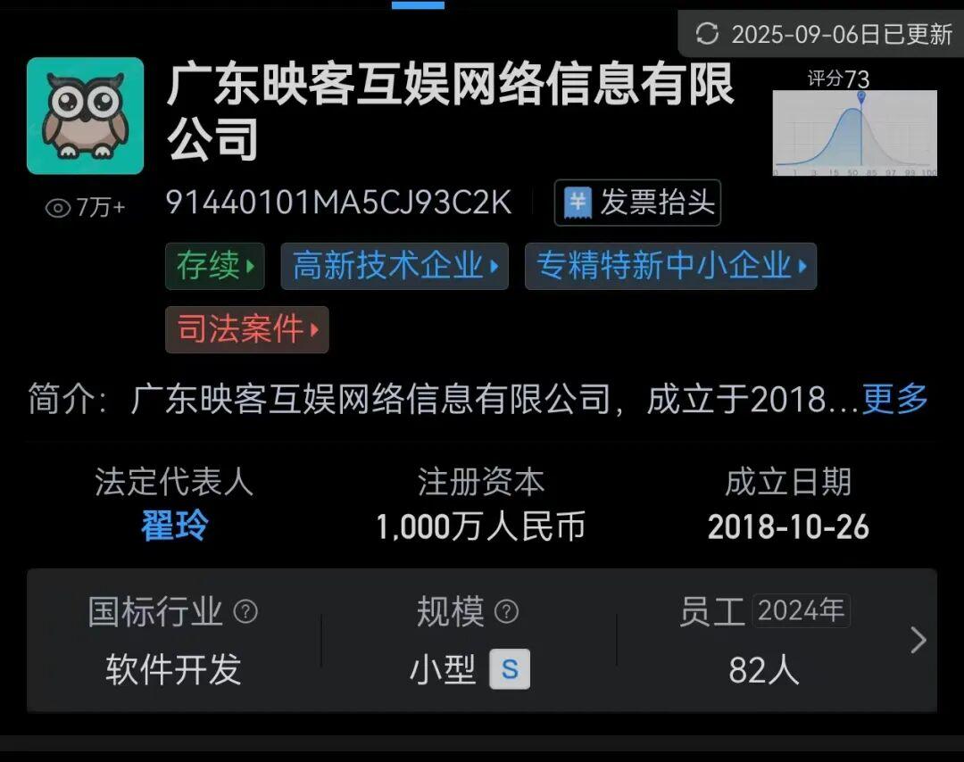 映宇宙海乐(广东)科技有限公司成立于2023年11月,注册资本500万元人民币,由Inke HongKong Limited全资持股。