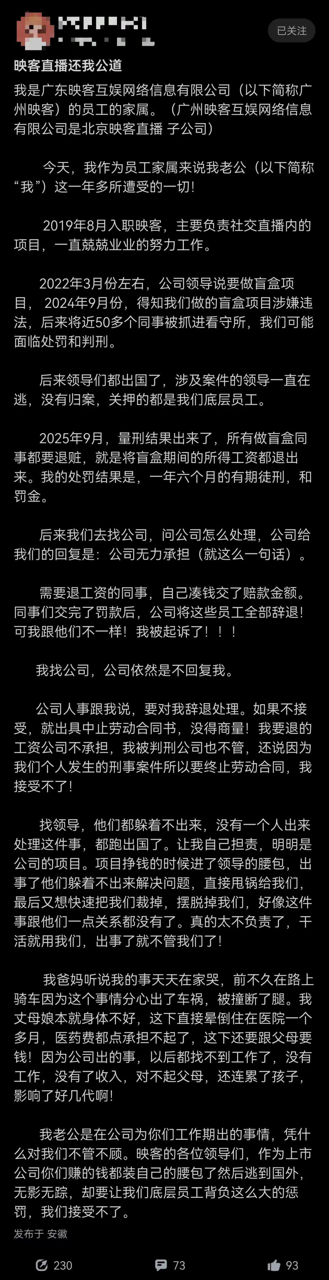 近日,一位自称是映客公司员工家属的网友在网络上爆料,称其丈夫在映客工作期间,因公司领导要求参与违法盲盒项目,最终被判一年半有期徒刑,并需退还违法项目期间的所有工资。这一事件迅速引发了社会各界的广泛关注。