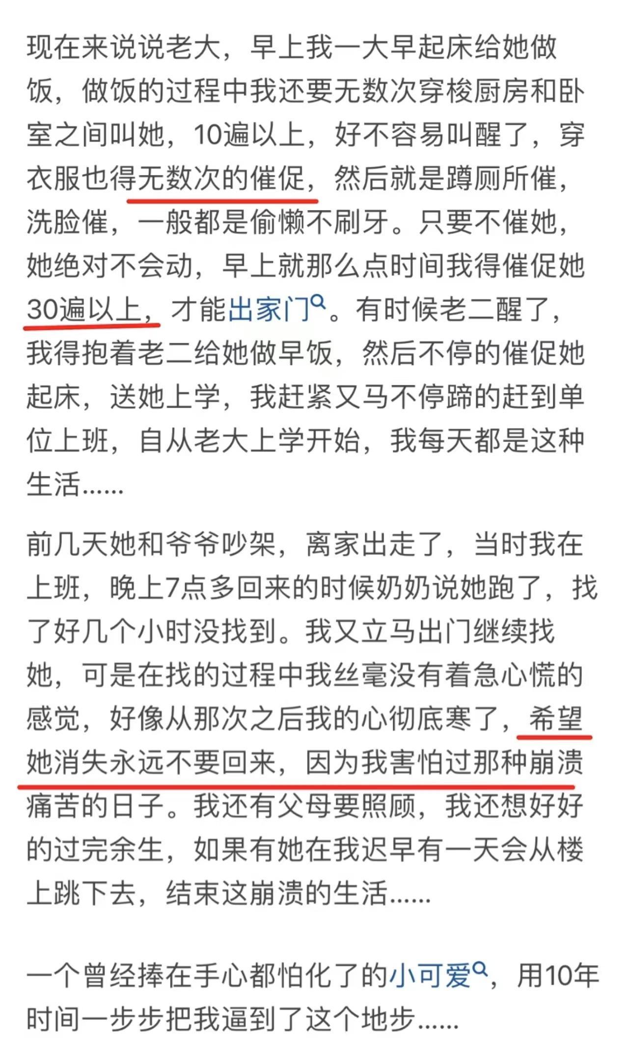 长期处于高压状态的她,情绪积压已接近爆发点,心理濒临崩溃。她开始毫不掩饰自己“越来越讨厌自己的女儿”的负面情绪,甚至在网上公开承认:“自己恨不得丢了她”。这一看似“不合格母亲”的发言,却引起了强烈的共鸣。