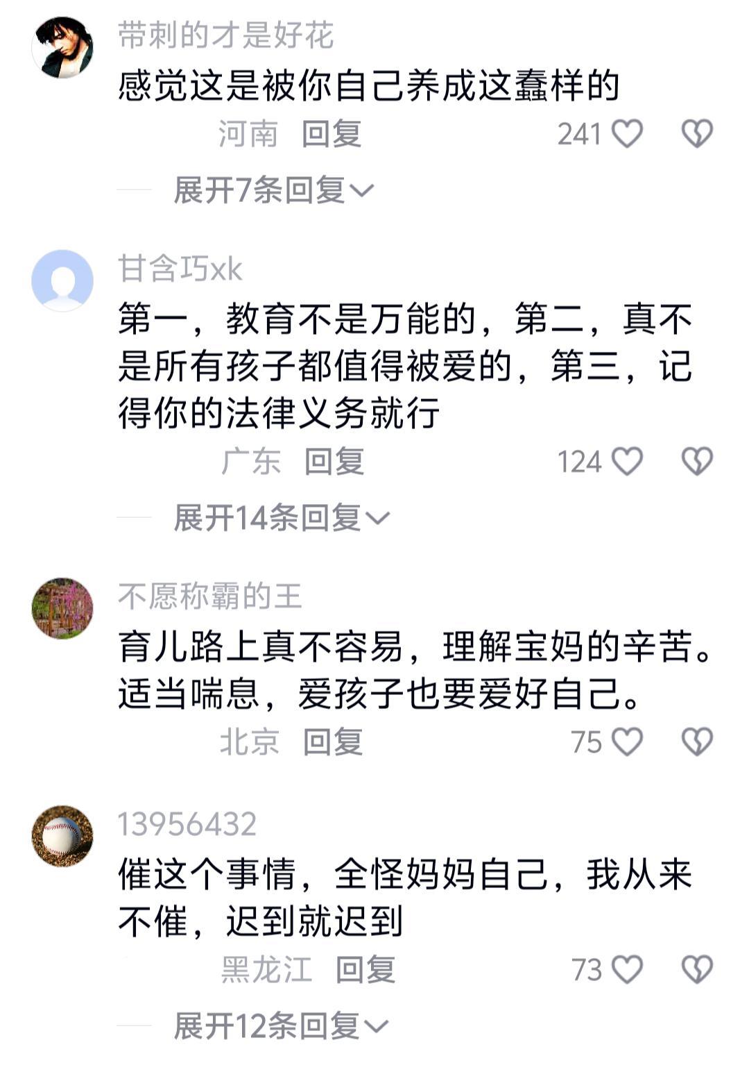 另一位家长的评论则是一针见血地总结出了这位家长在家庭教育中的误区,他坦言:“第一,教育不是万能的,第二,真不是所有孩子都值得被爱的,第三,记得你的法律义务就行。”