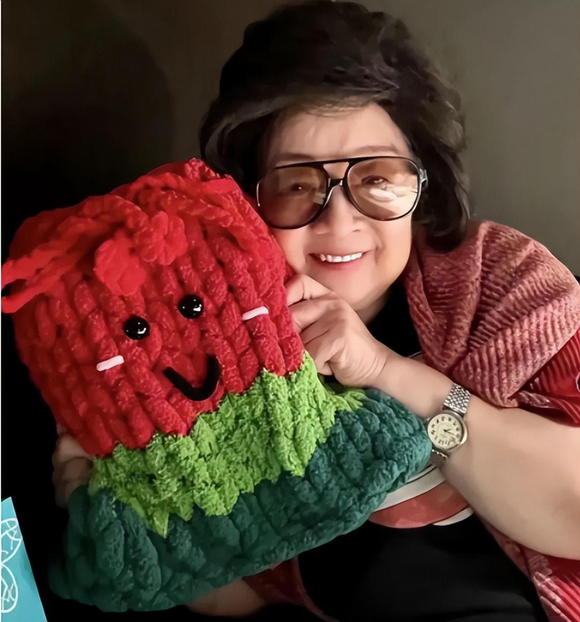 笑容优雅,手里还拿着自己织的西瓜包,还给包包上织了个大大的笑脸。