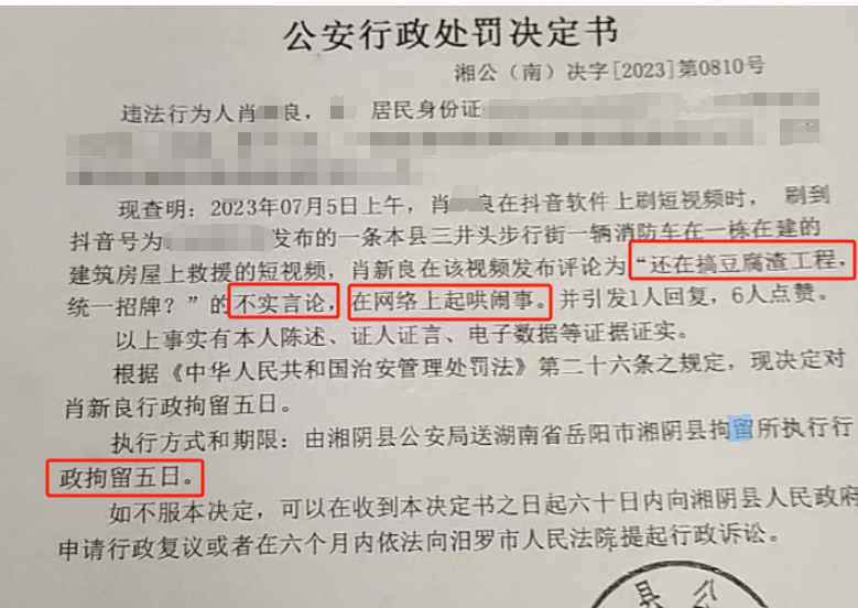 再审判决书显示,湖南省高院审理认为,肖新良作为一名成年公民,在未经求证他人短视频内容与文案真实性的情况下,使用“豆腐渣工程”影射湘阴县某镇某村统一制作门店招牌的事项。肖新良发表该评论虽不当,但该评论并没有具体的指向对象,其评论下有六人点赞、一人评论,社会不良影响轻微,可以予以批评教育,但认定为扰乱公共秩序或者寻衅滋事的证据不足。湘阴县公安局的处罚决定认定事实不清,证据不足,过罚明显不当。应予撤销。