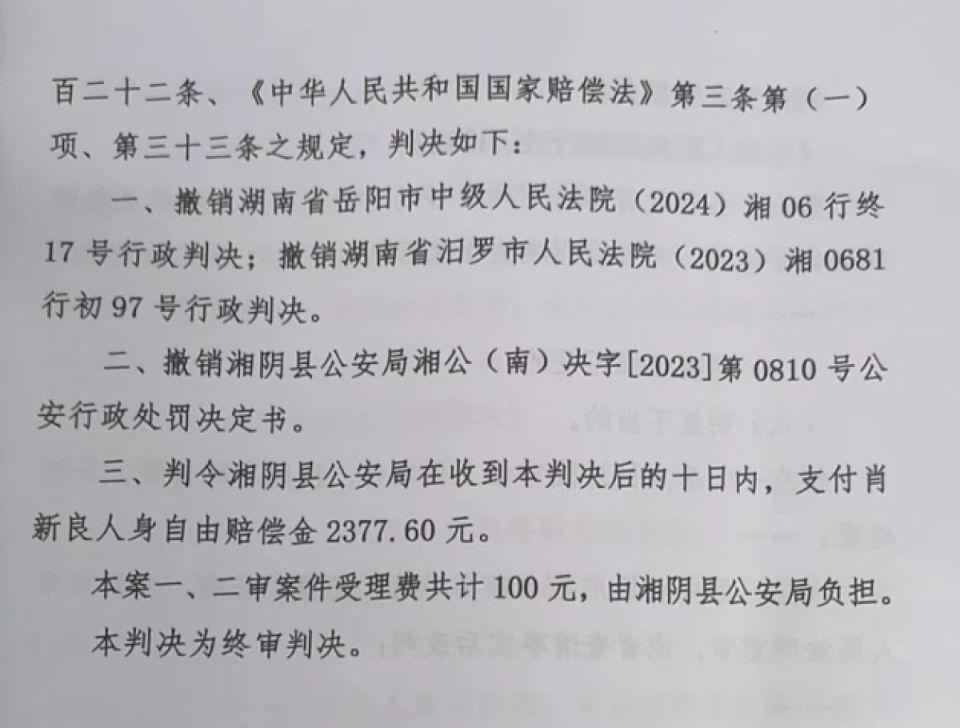 2025年6月25日,湖南高院做出再审判决,撤销一审、二审行政判决和公安行政处罚决定书,判令湘阴县公安局支付肖新良人身自由赔偿金2377.60元。