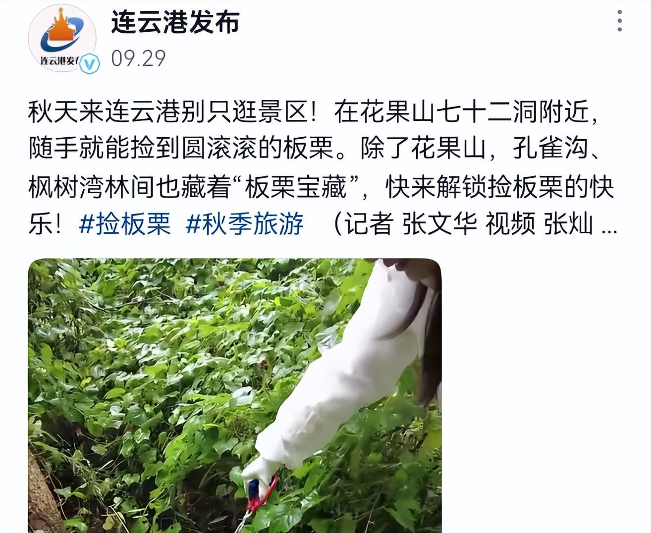 国庆节前夕,江苏连云港的官方文旅账号还在热情地向世界发出邀请,视频里洋溢着秋日的惬意,鼓励大家来花果山体验“捡板栗的快乐”,看得不少人心里暖暖的,决定国庆假期就去花果山景区游玩。