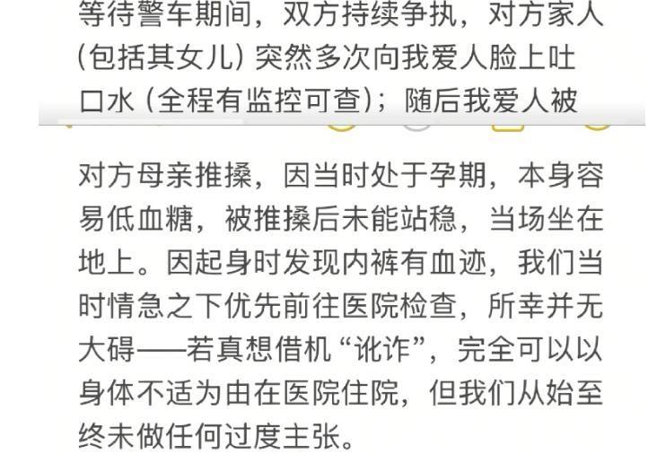 她先是停顿片刻,随即顺势倒地并抛出了一个重磅炸弹——自己已怀孕两月,更惊人的是,她声称在冲突中“见红”,有流产风险,这一连串的指控招招致命,瞬间将对方置于极其不利的境地。