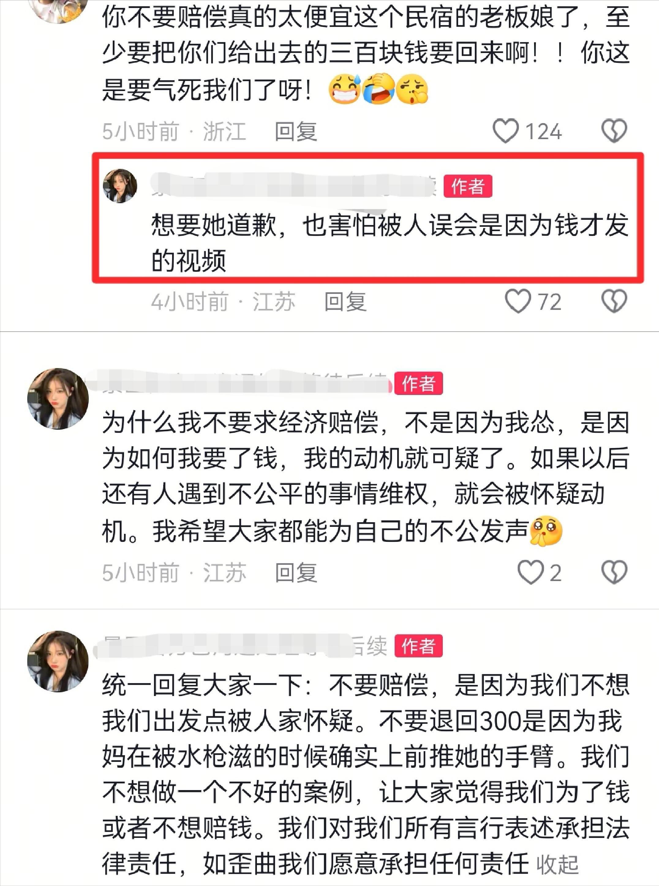 很快警方赶到了现场,民宿老板上来就狮子大张口,索要2000块钱,最后在调解下,游客这边才赔了300块钱的营养品费用,气不过的他们把这件事发在了网上,没有别的诉求,就是要对方一个道歉。