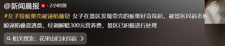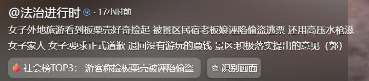 故事的起点很简单,是一位女游客的好奇心,她带着家人——母亲、外婆、弟弟去景区游玩,途中遇到从未见过的带刺板栗壳,觉得新奇便捡起一个空的瞧瞧,这本是再正常不过的举动,却被民宿这边瞬间定性为“偷盗”,指控的升级来得又快又猛,让女游客措手不及。
