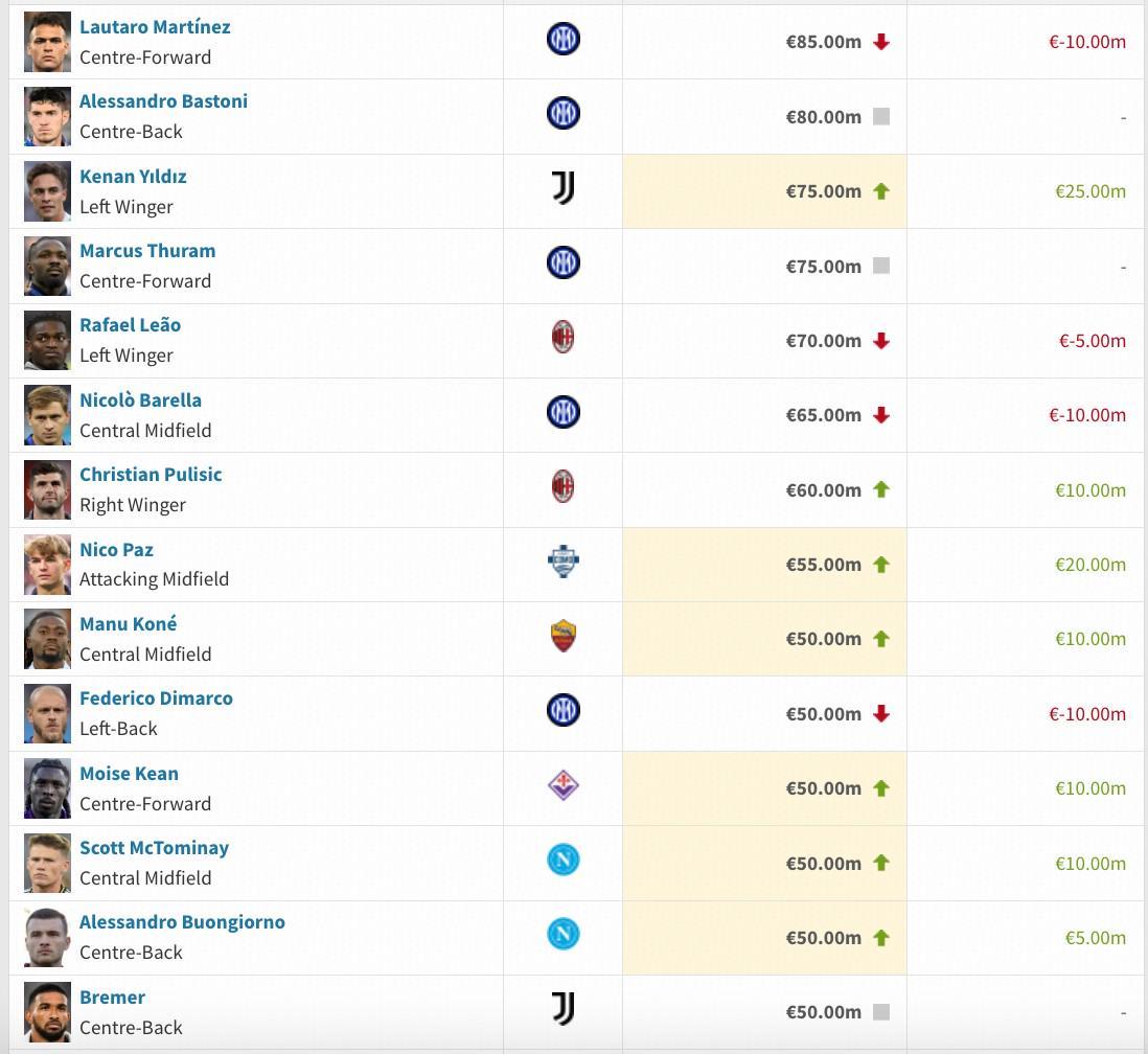 在本次身价更新中,最引人注目的莫过于尤文图斯的新星伊尔迪兹。他的身价竟然暴涨了2500万欧,一举来到了7500万欧的高度,与马库斯-图拉姆并列意甲球员身价第三。这一巨大的涨幅,无疑让伊尔迪兹成为了本次身价更新中的最大亮点。