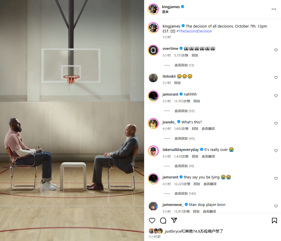 詹姆斯的预告发布后,NBA圈内迅速掀起讨论热潮。灰熊队球星贾·莫兰特在评论区连发两条留言,先是直接表示“不”,随后又调侃道:“他们说你在骗人(笑哭表情)”。湖人队友范德比尔特则直接询问:“这是什么意思?”而詹姆斯的前队友凯文·乐福更是晒出乔丹2003年退役演讲的视频,并打趣称:“决定二”,暗示詹姆斯可能效仿乔丹的退役方式。