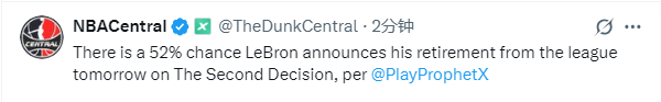 据美国顶级体育预测市场ProphetX的数据显示,詹姆斯在10月7日宣布退役消息的概率为52%。这一数字引发了更多猜测,毕竟詹姆斯即将年满41岁,虽然他在媒体日上表示依然享受备战过程,但年龄和体能问题始终是运动员无法回避的现实。