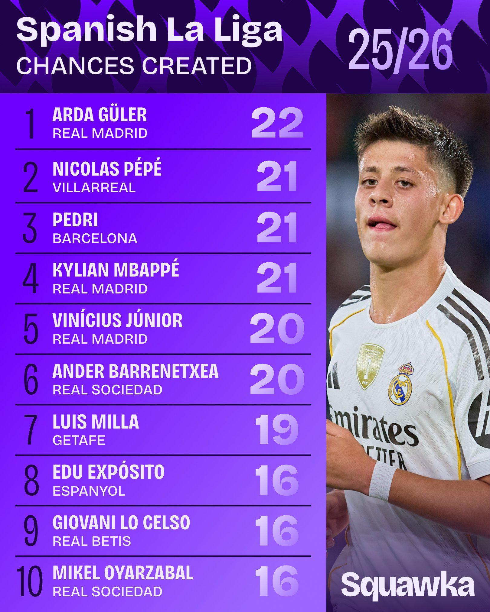 具体来看,居莱尔凭借其出色的传球视野和创造力,在联赛中多次为队友送出致命传球,成为皇马进攻端的重要武器。而紧随其后的尼古拉斯·佩佩(比利亚雷亚尔)和佩德里(巴塞罗那)则以21次创造机会并列第二,展现了他们作为中场核心的强大实力。