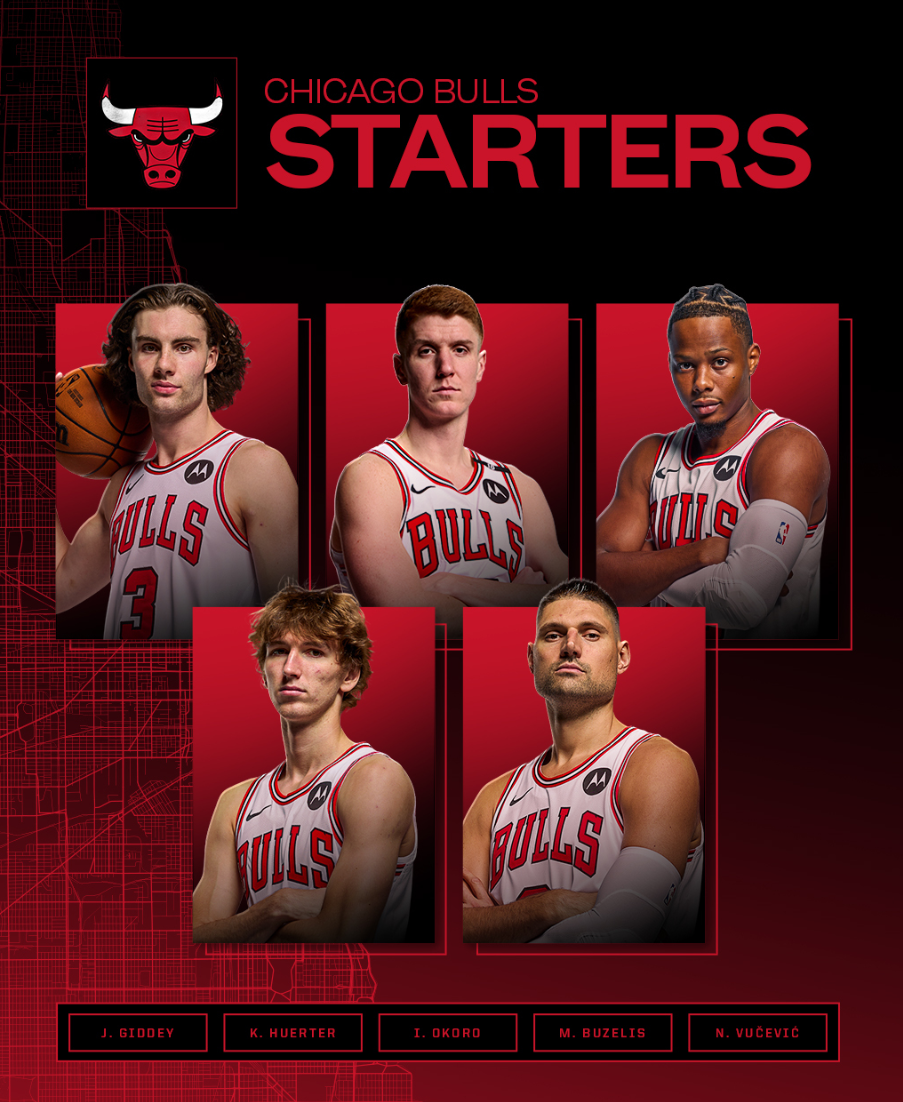 本场比赛公牛队的首发阵容为吉迪、赫尔特、奥科罗、布泽利斯和武切维奇。新赛季这套先发阵容的唯一悬念在于怀特是否会取代赫尔特或奥科罗的位置,其余四个席位已基本确定。布泽利斯也正式进入职业生涯第二个赛季,成为球队重建期的核心培养对象。