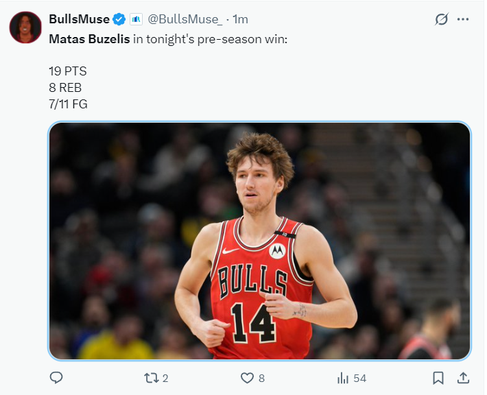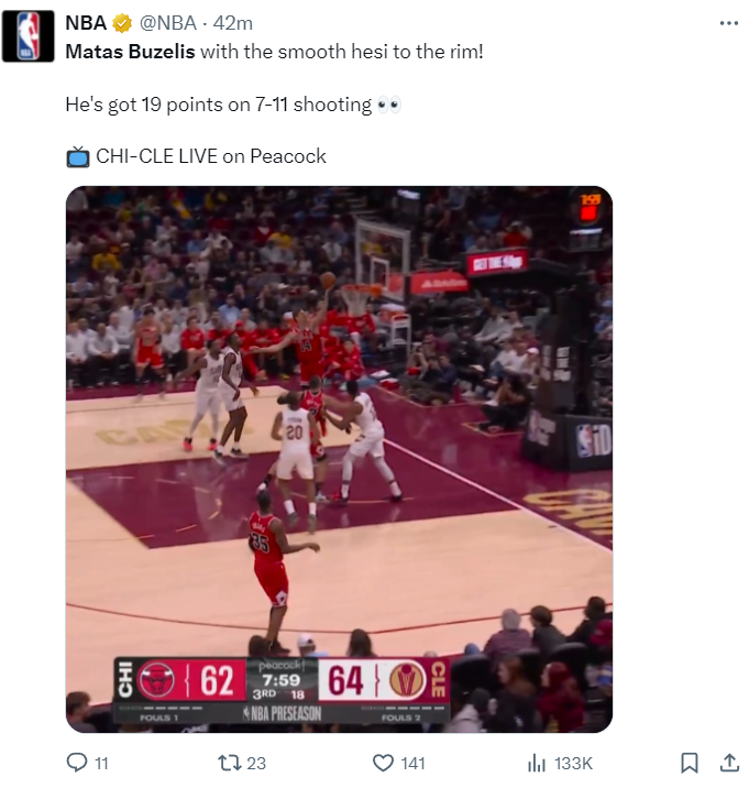 公牛队在送走德罗赞、拉文、鲍尔后,正积极兜售武切维奇、帕威等球员,明确进入重建期。作为球队重点培养对象,布泽利斯在本场比赛中仅出战18分钟,便11投7中,三分5中2,罚球4中3,高效砍下19分8篮板1助攻1盖帽,命中率63.6%,三分命中率40%。