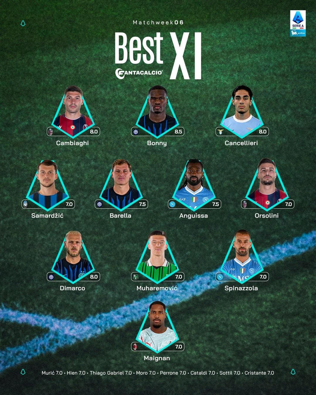 奥尔索利尼(博洛尼亚)7.0分、安古伊萨(那不勒斯)7.5分、巴雷拉(国际米兰)7.5分、拉扎尔-萨马尔季奇(亚特兰大)7.0分