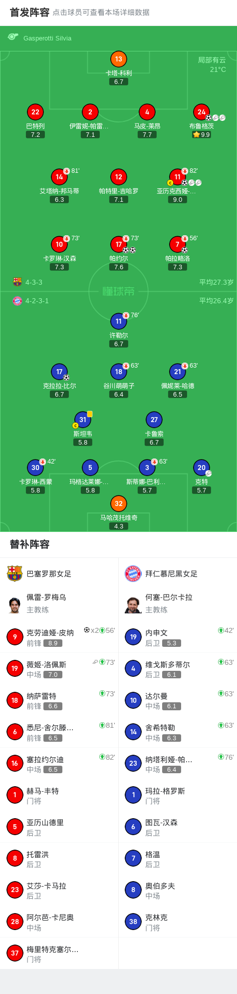 本场比赛,巴塞罗那女足的克劳迪娅-皮纳和帕约尔均表现出色,两人均梅开二度,成为球队获胜的关键。而拜仁慕尼黑女足虽然也有克拉拉-比尔的破门,但整体表现明显不如巴塞罗那女足。