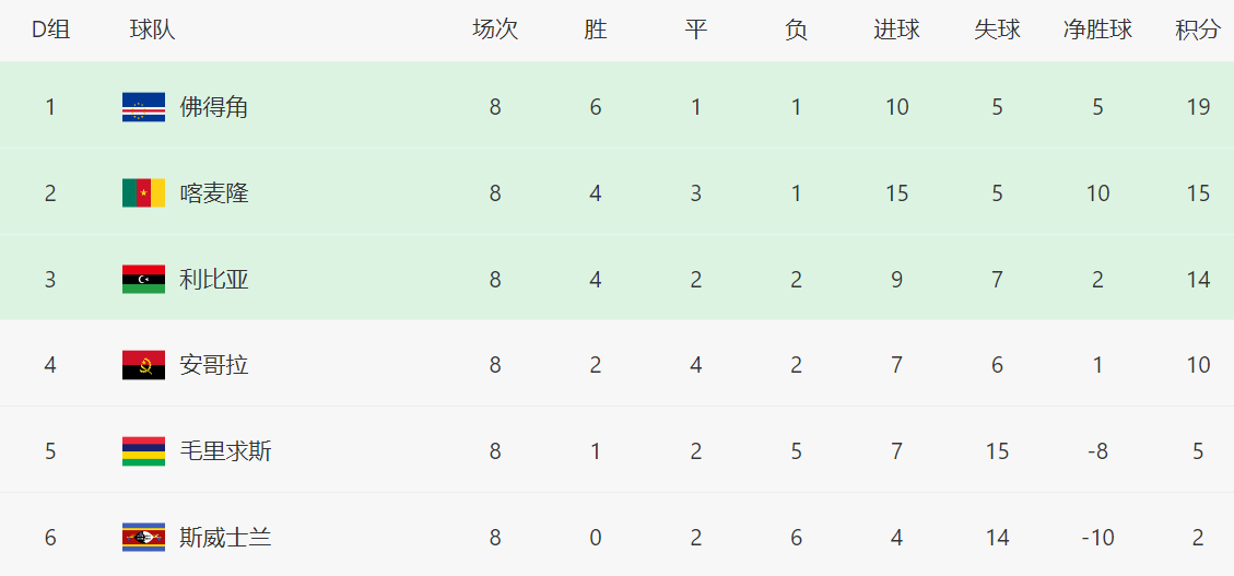 8轮战罢,佛得角以6胜1平1负积19分的战绩稳居小组榜首,领先第二名喀麦隆4分。在非洲区9个小组头名直通世界杯的规则下,这支岛国球队距离历史性突破仅差一场胜利。