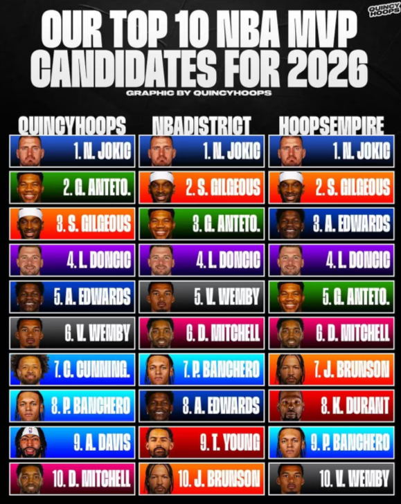 近日,美国三大权威媒体Quincy Hoops、NBA District和Hoops Empire纷纷公布了他们对25-26赛季常规赛MVP前十的预测榜单。尽管各家媒体的具体排名存在差异,但有一个共同点引起了广泛关注:即将年满41岁的勒布朗·詹姆斯被排除在了前十之外,而37岁的斯蒂芬·库里也未能入选。