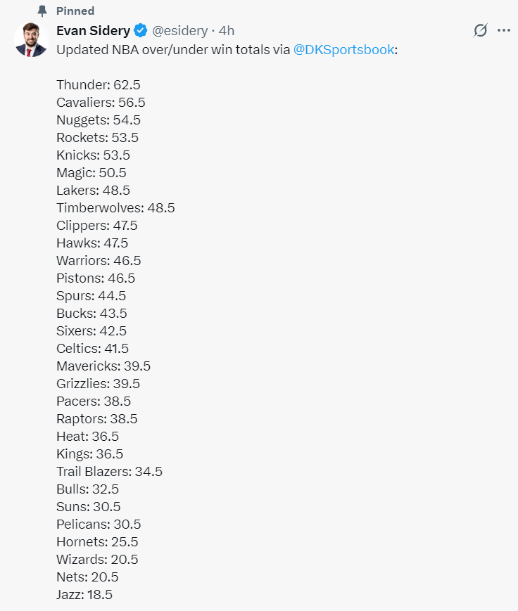 北京时间10月8日,另一家权威美媒DKSportsbook发布了其对新赛季NBA30支球队战绩的全面预测,引发了广泛关注和讨论。根据该预测,新赛季各队战绩排名如下: