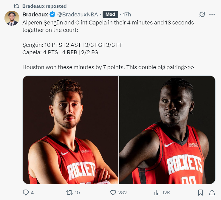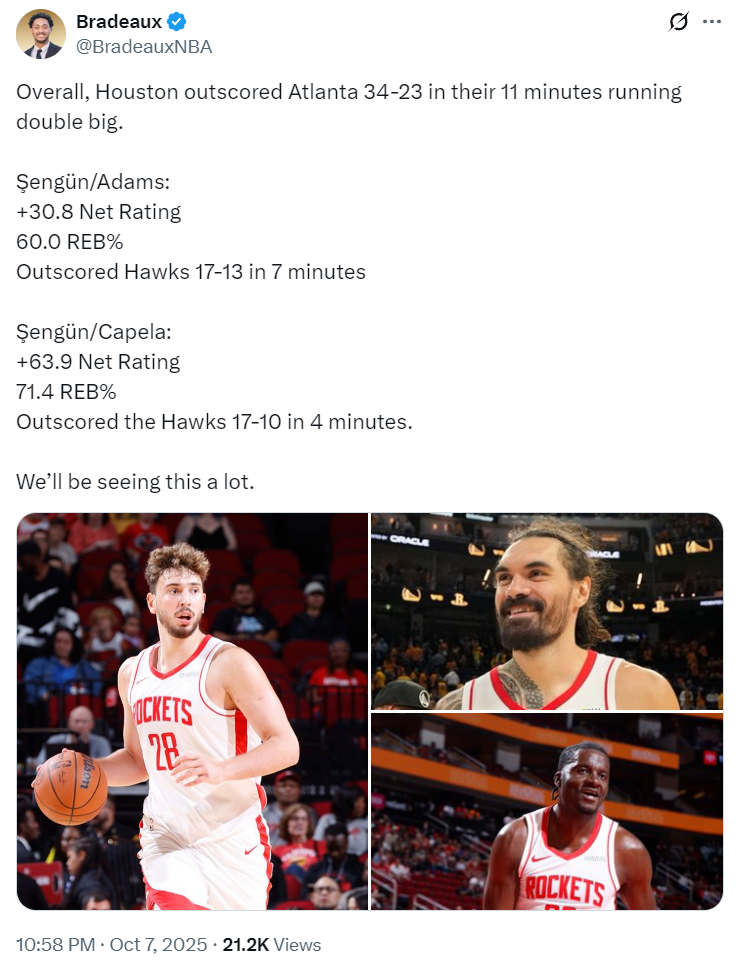 Bradeaux还进一步晒出了申京与亚当斯、卡佩拉分别搭档双塔时的效率数据。申京与亚当斯搭档时,净效率值高达+30.8,篮板率达到60%,在7分钟内以17-13领先老鹰;而申京与卡佩拉搭档时,净效率值更是飙升至+63.9,篮板率高达71.4%,在4分钟内便以17-10领先老鹰。这些数据充分展示了双塔战术在比赛中的巨大优势,也预示着新赛季我们将频繁看到这样的组合出现在赛场上。