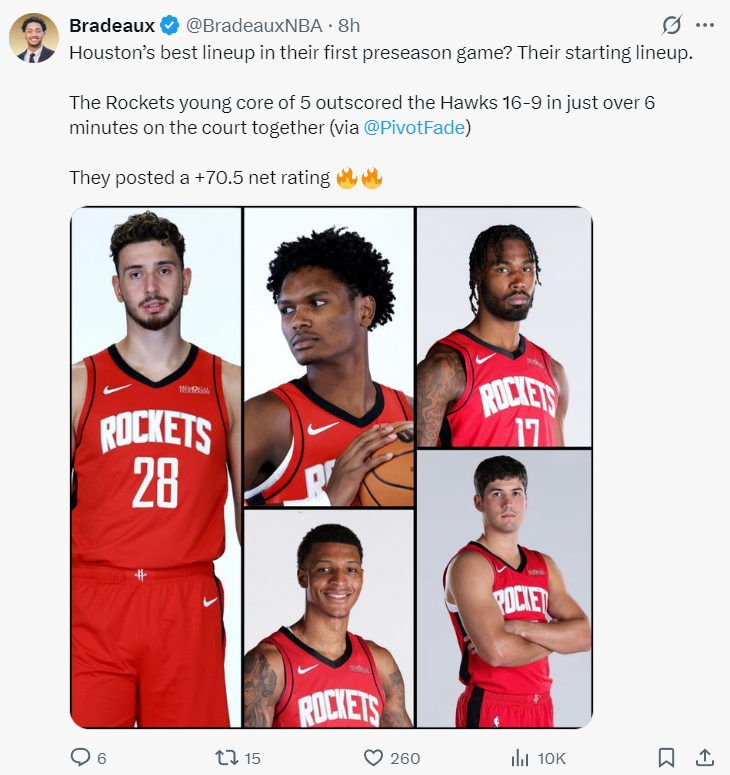 在首场比赛中,火箭队的先发五虎全部来自于球队的选秀,谢泼德、阿门、伊森、小贾和申京仅仅搭档了6分钟,期间火箭队便以16-9领先老鹰,净效率值高达+70.5。这一数据无疑证明了申京在每一套阵容中的绝对领袖地位。