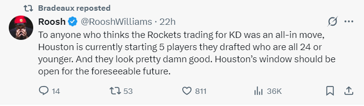 火箭队记者RooshWilliams在社交媒体上写道:对于那些认为火箭队交易来KD是孤注一掷的选择的人来说,这无疑是一个迎头痛击。实际上,火箭队换来KD是锦上添花之举。火箭队自己选中的五位球员都是主力,而且他们都不超过25岁,这些年轻球员的表现非常出色,休斯顿火箭队的未来很长时间内都将充满广阔的发展前景。