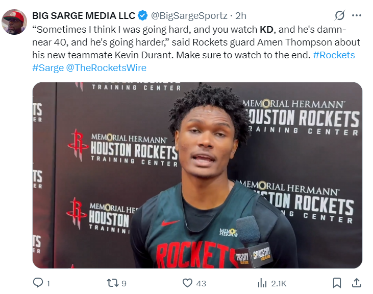 阿门在训练后接受采访时谈到了KD,他表示:我本来觉得自己已经很努力了,但你们看看KD,他都快40岁了,但表现的比任何人都还要出色。我还有什么借口不更加努力呢?阿门的这番话,无疑展现了火箭队年轻球员对KD的敬佩以及自我激励的精神。