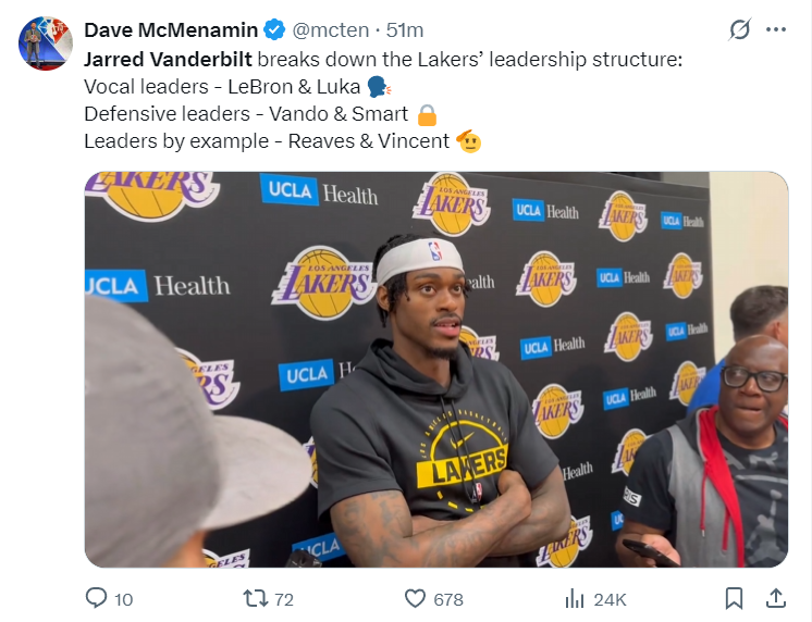 北京时间10月8日,湖人队前锋贾里德·范德比尔特(昵称“阿彪”)在球队训练后接受了媒体采访。他详细解析了湖人队的领导架构,将自己定位为防守端的领袖。