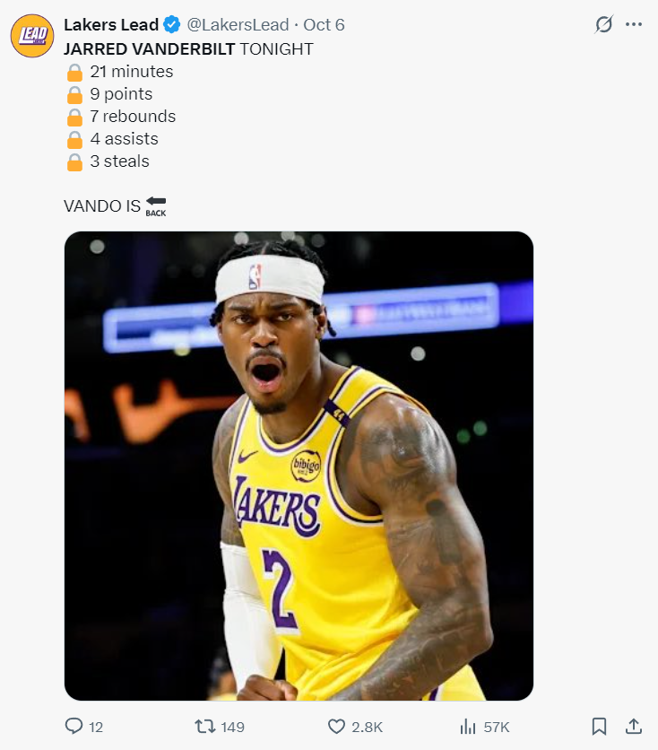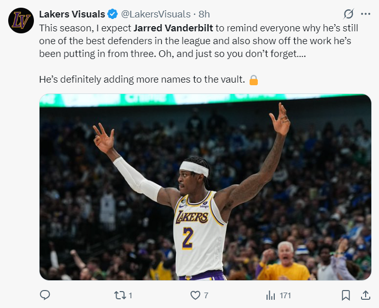 早在八小时前,湖人媒体Lakers Visuals就力挺范德比尔特,表示期待他本赛季能再次成为联盟中最顶级的防守者之一,并展示他在三分投射上的努力与进步。范德比尔特也确实在为自己的“保险库”添加更多需要锁定的对手名字。