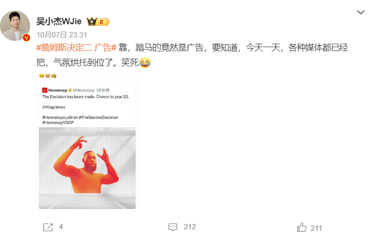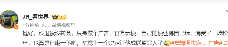 3. “官方玩梗,勒布朗自己的梗也玩,消费粉丝也算自嘲一下,毕竟决定一让他成为联盟罪人。”