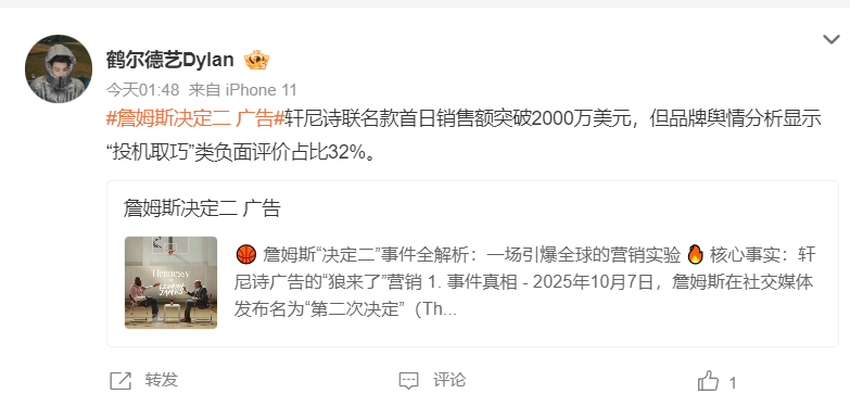 北京时间10月7日晚,NBA巨星勒布朗·詹姆斯(LeBron James)在个人社交媒体上提前公布了备受瞩目的“决定二”——他将与知名干邑品牌轩尼诗(Hennessy)合作,推出联名限定款“勒布朗·詹姆斯臻选V.S.O.P干邑”。这一消息迅速引发了广泛关注,但随后的舆论反响却出乎意料。