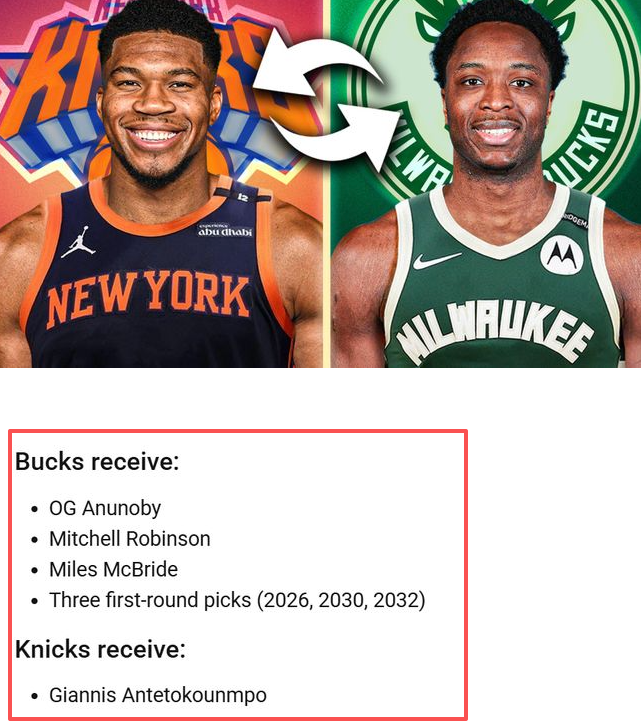 另一方面,关于字母哥的潜在交易方案已浮出水面。美媒近期晒出尼克斯与雄鹿的1换6交易构想:尼克斯送出阿奴诺比、米切尔-罗宾逊、麦克布莱德三位即战力球员,外加三个首轮签,从雄鹿换来字母哥。从筹码价值来看,阿奴诺比是联盟顶级的3D侧翼,米切尔-罗宾逊能补强内线防守,三个首轮签则能为雄鹿未来重建提供关键资产,这样的报价对已濒临“重建边缘”的雄鹿而言,无疑是极具吸引力的选择。而对尼克斯来说,得到字母哥后,将能组建起“字母哥+现有核心”的争冠阵容,进一步巩固东部顶级强队的地位。