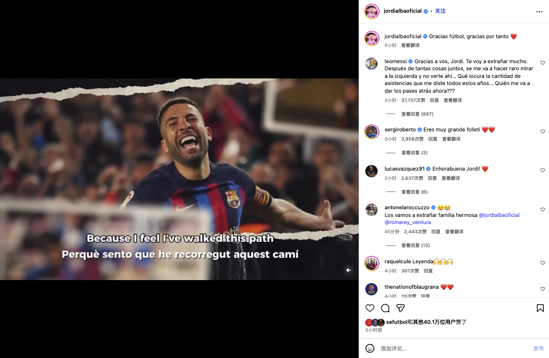 雷速体育10月8日讯 近日,迈阿密国际与前巴塞罗那后卫阿尔巴通过社交媒体宣布,将在本赛季结束后正式挂靴,结束长达17年的职业生涯。这一消息引发足坛震动,而与阿尔巴并肩作战13年的双料队友梅西,也在第一时间通过社媒评论区向老友送上深情告别。