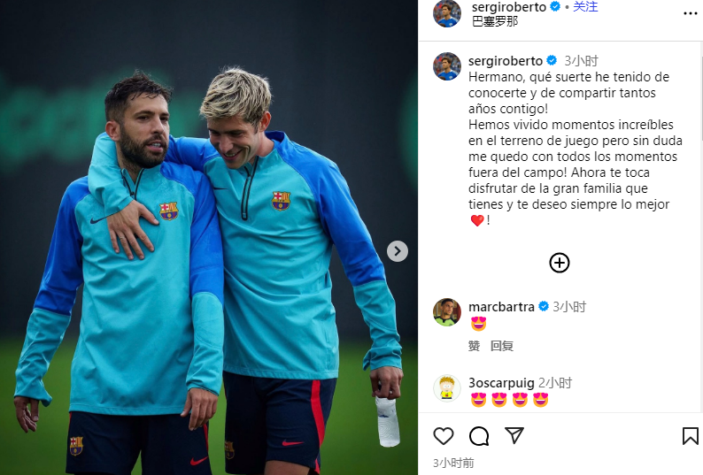 雷速体育10月8日讯,近日,前巴塞罗那球星罗伯托在社交媒体上发布了一篇深情的告别文章,向他的昔日队友阿尔巴表达了自己的感激与祝福。阿尔巴在结束其辉煌的职业生涯后,罗伯托的这篇告别文引起了广泛关注。