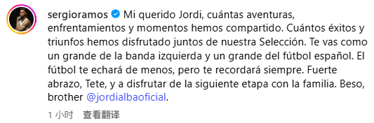 拉莫斯在社交媒体上写道:“我亲爱的约迪,我们一起经历了多少冒险、对抗以及无数精彩的时刻。在国家队的日子里,我们共同见证了无数胜利与荣耀。足球世界将会想念你,而且永远会铭记你的贡献。我想好好拥抱你,并祝愿你和家人一起享受人生的下一个阶段。吻你,兄弟。”